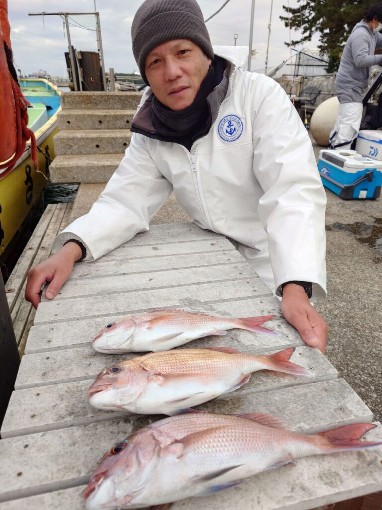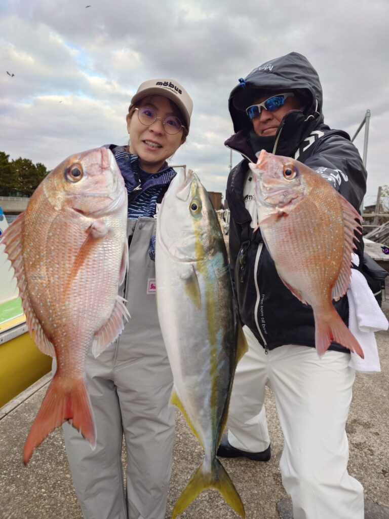 今年も残すところ後5日となりました!真鯛はと言うと今日は場所を転々と回り皆さんゲット成功!坊主無しと良かったです(⁠^⁠^⁠)トップ3枚!2番手2枚でイナダ、ウマヅラ、平ソーダ、ハタが交じりました〜!