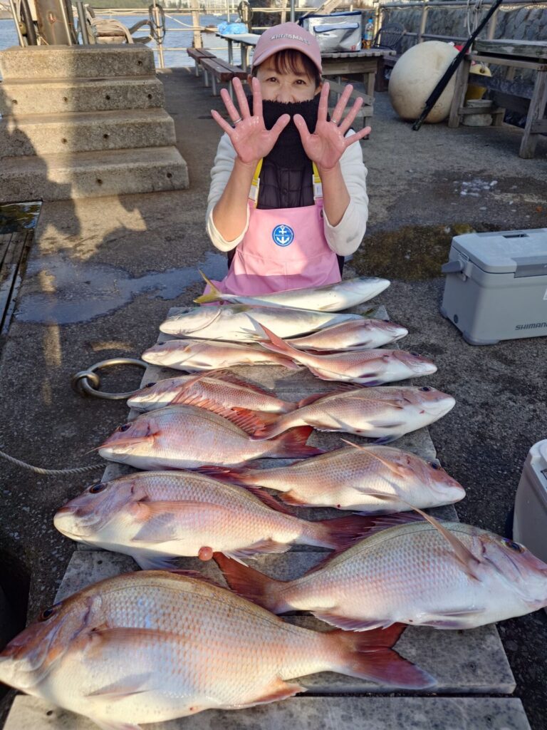 今日は魚のご機嫌良く当たり活発でした〜(^^)トップは女性の方で10枚!2番手7枚!6枚2名等々、皆様複数枚ゲットで良かったです!他にイナダ、黒鯛が交じりました!スッポ抜けもいくつかありました。