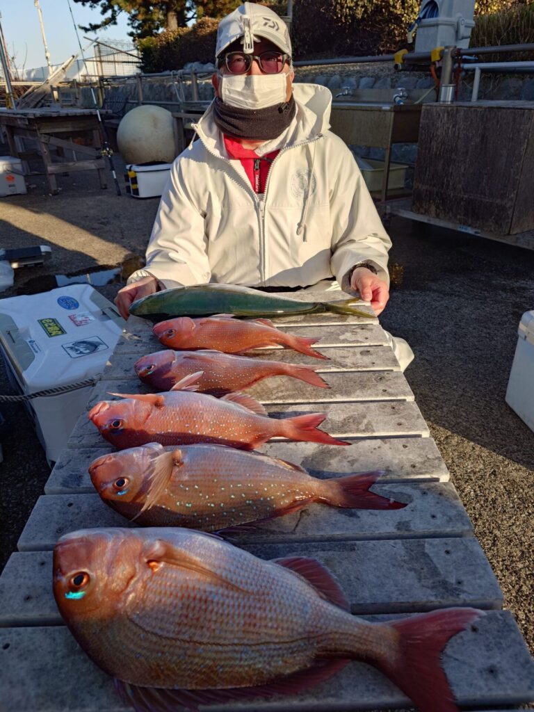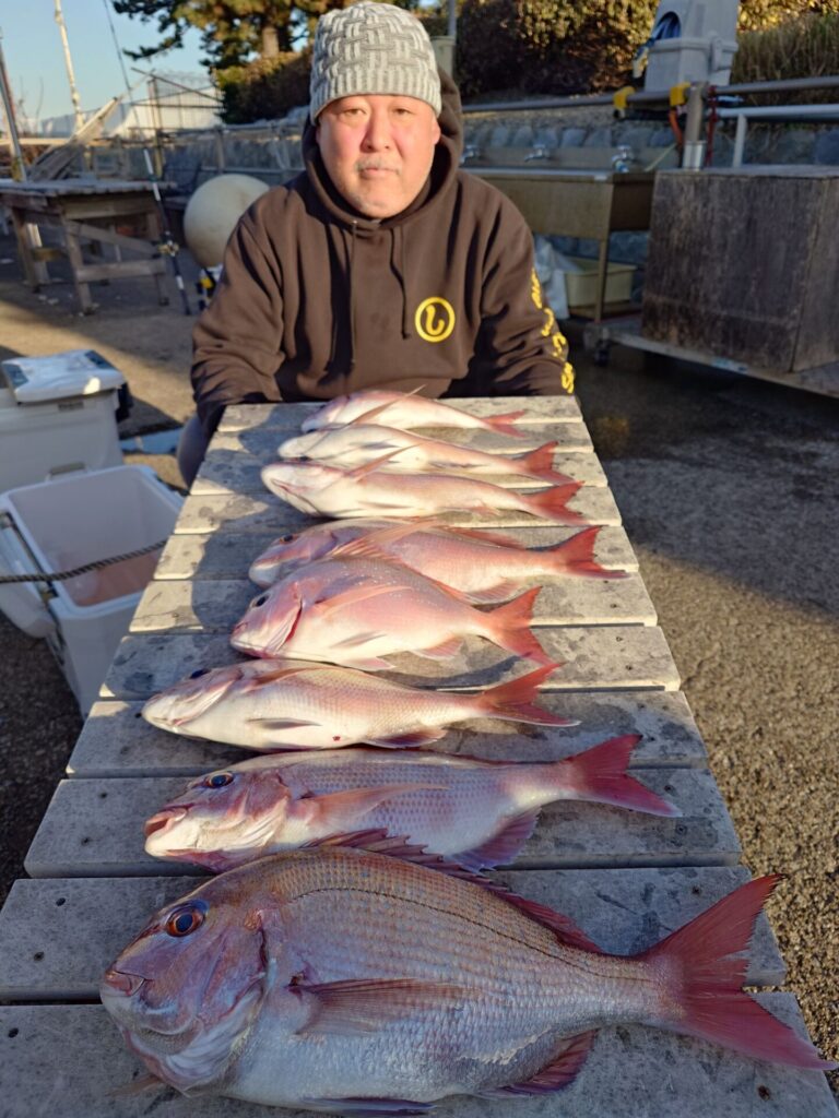 今日は午前中反応出て来ても水色澄み当たりが中々出ませんでしたが、午後からようやく当たりが活発になって来てくれました(^^)トップ8枚!2番手5枚!バラシ、スッポ抜け等等々ありました……。他にはイナダ、黒鯛、イサキが交じりました!脂の乗った越冬真鯛!是非とも釣って下さいm(_ _)m