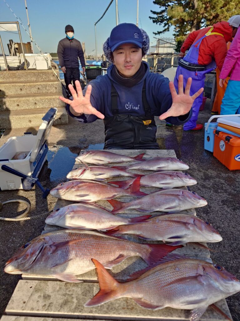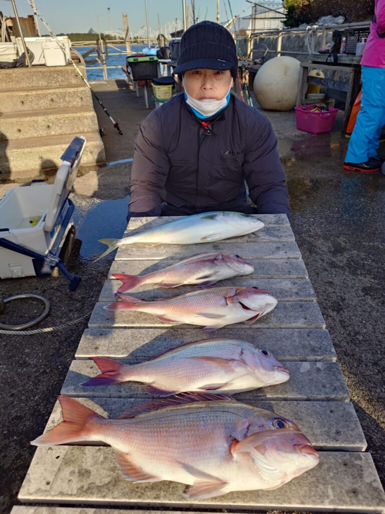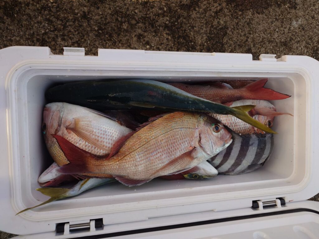 今日は反応モリモリで魚もご機嫌でした〜(⁠^⁠^⁠)トップは4隅以外の方で10枚!2番手7枚!3番手5枚!4枚3名!等々で当たり活発でした!他に石鯛、イナダ、黒鯛がポツポツ交じりました!