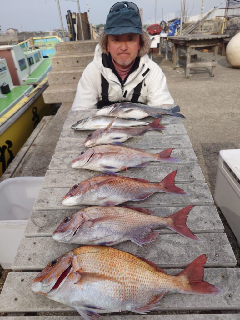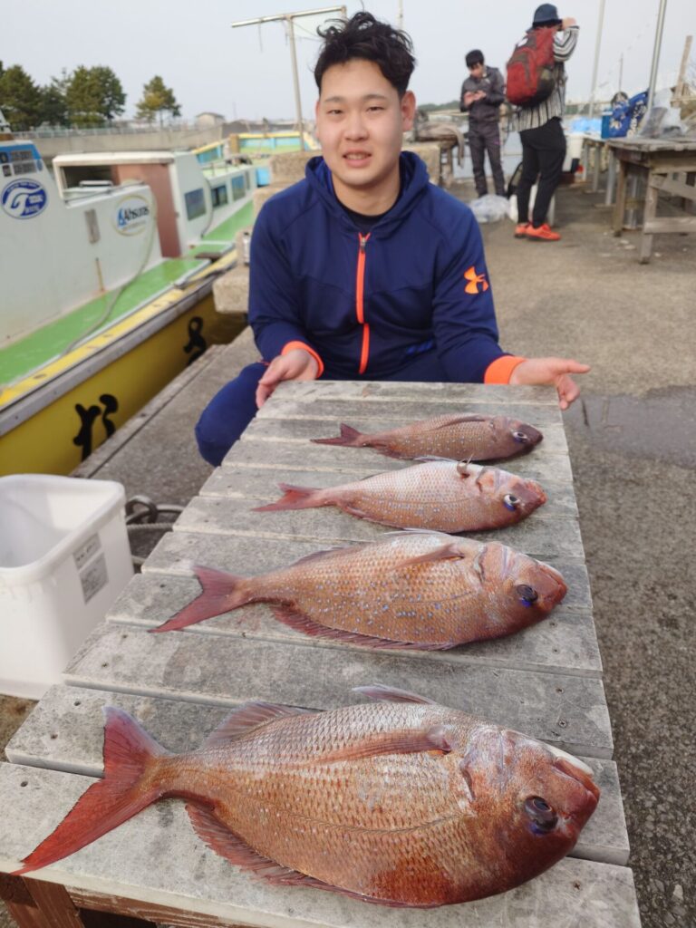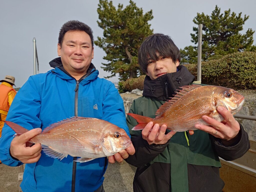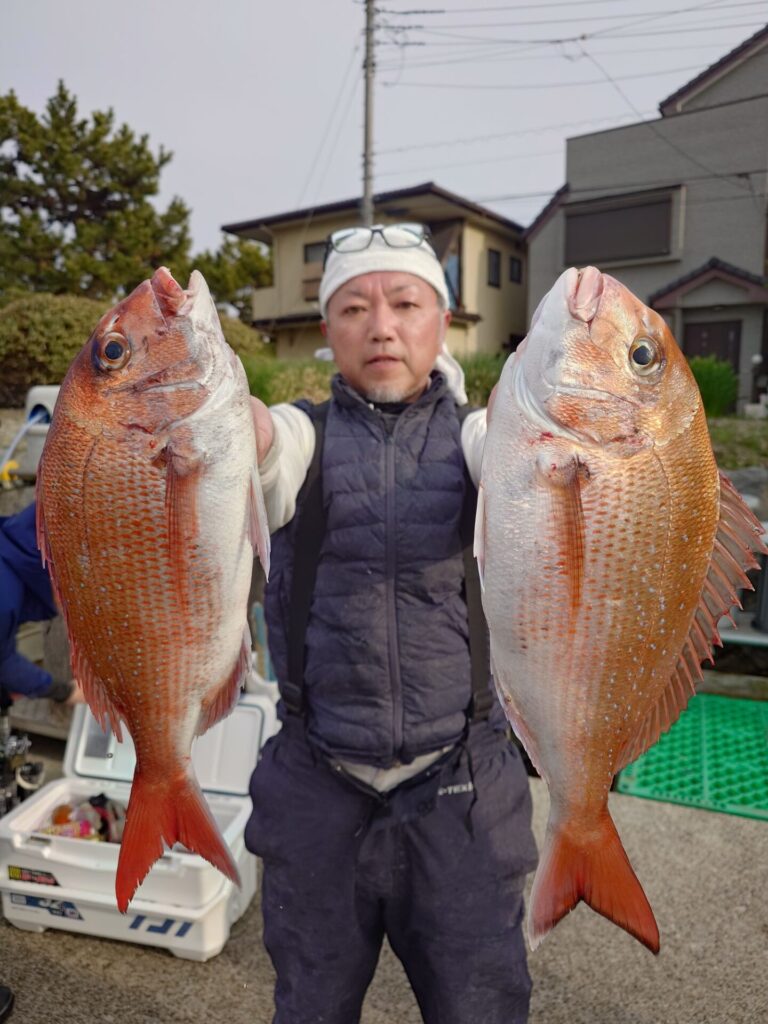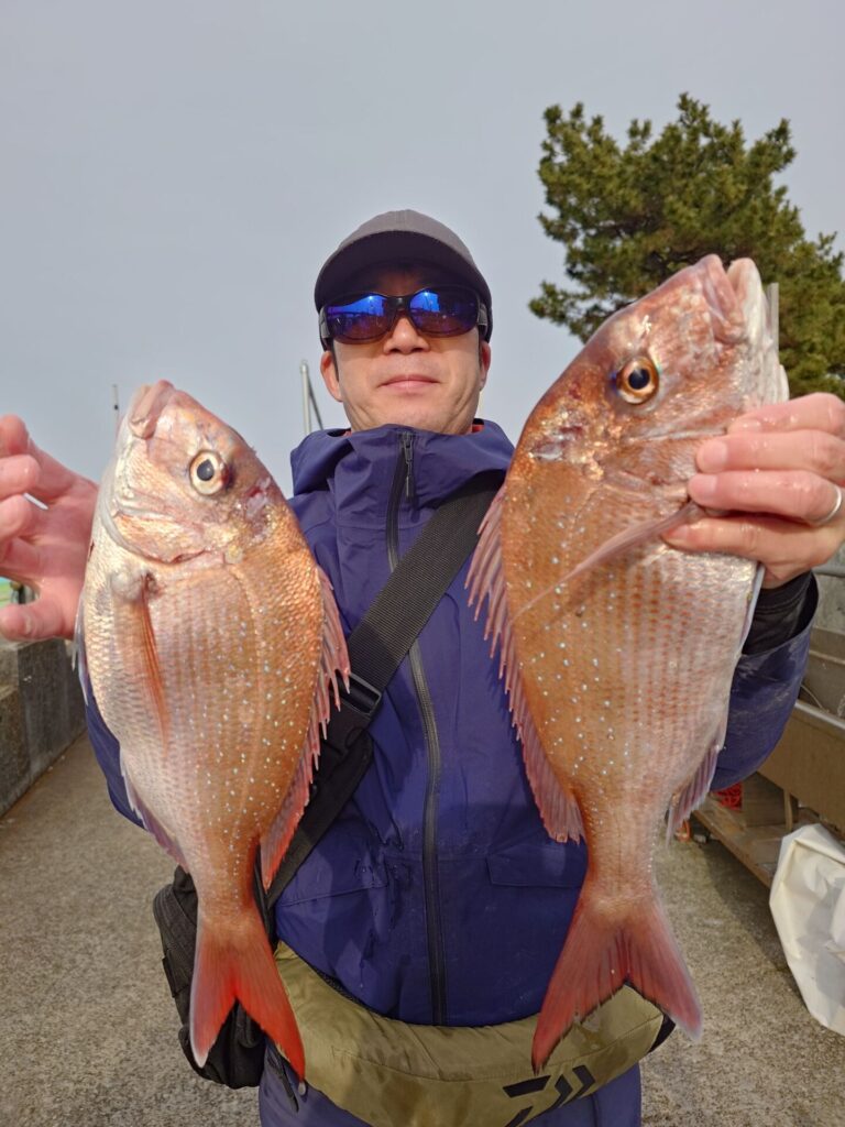 今日の午前中は反応あるのに棚が揃わず大苦戦〜>⁠.⁠<午後になりやっと棚が揃う様になって来てプチ盛り上がりがあり、パタパタっと真鯛が釣れました! この釣りは棚取りが本当に大事なんです!PEラインの色としるしをちゃんと見て、正確な棚取りをお願いしますm(_ _)m決して難しい事では無いので!もし、分からなければ教えますので当日早めにご来店下さいm(_ _)m