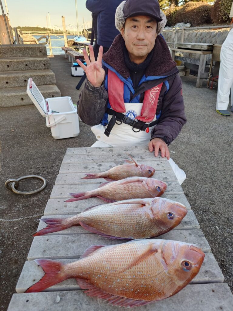 時化後の今日は水色澄み、水温上昇等で朝から苦戦!>.<エサ取りも多く中々当たりが出ませんでした……。それでも皆さん頑張って頂いた甲斐あってか、後半戦はポツンポツンと当たりが出ました〜!トップは3枚2番手2枚2名!イナダ交じりでした。
